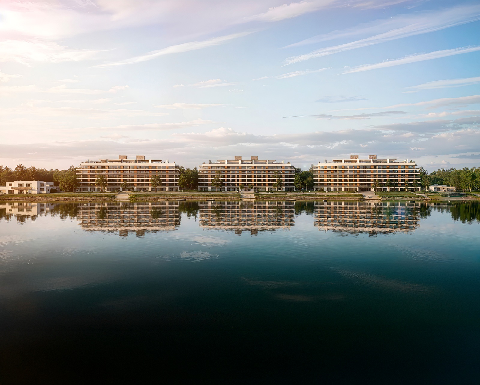 El desarrollo incorpora además un paseo ribereño integrado al paisaje, amenities pensados como extensión del entorno y la posibilidad de realizar actividades náuticas sin motor. Entre los espacios comunes se incluyen canchas de tenis, piscinas y solárium con vistas abiertas a la laguna, área wellness, espacios de coworking, terraza con parrillas, muelles y un paseo ribereño que conecta los distintos sectores del proyecto.